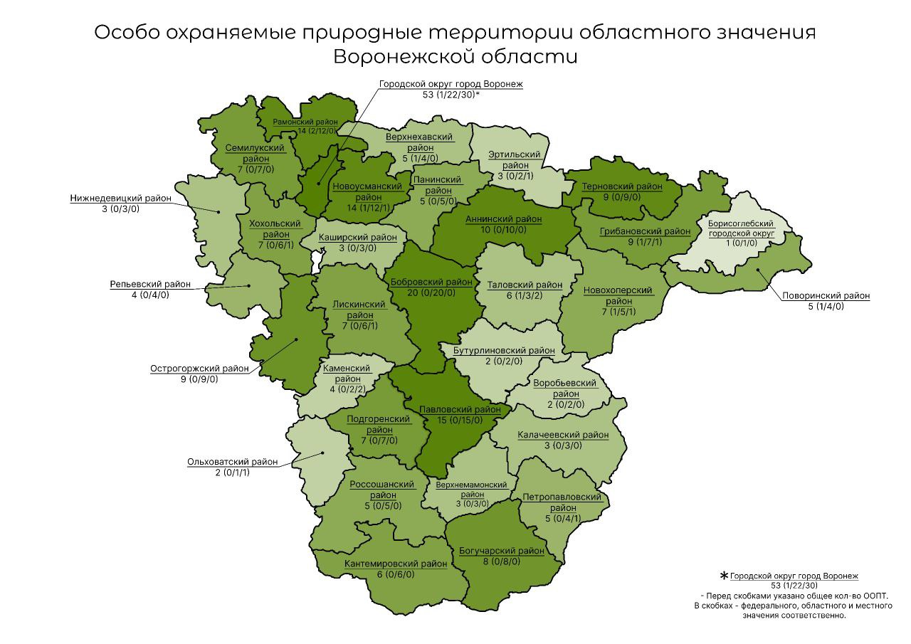 - создали новые ООПТ областного значения – заказник «Ольховатский» и памятник природы «Большой Мартын» в Панинском районе. В процессе создания ООПТ «Таврово», «Шиловское озеро», «Березовый яр» и «Колыбелкинский пещерный комплекс».