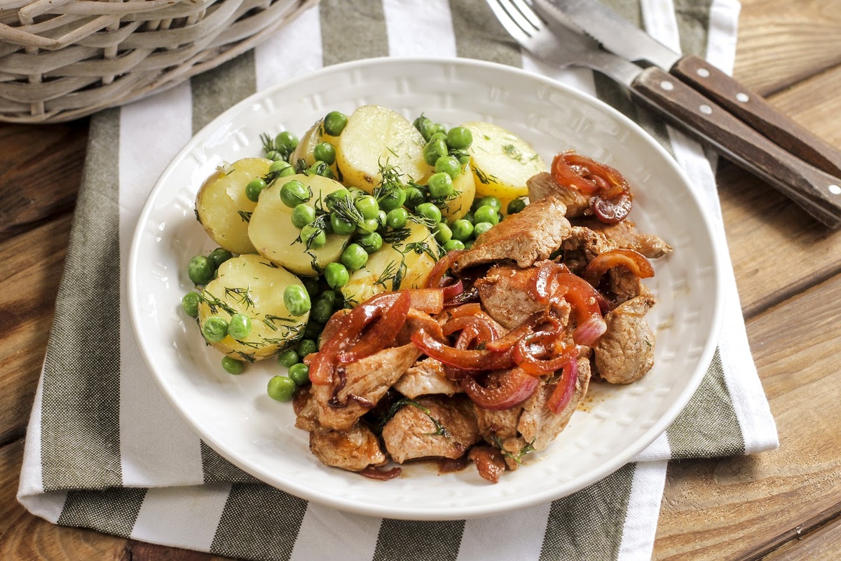 Шаг 2: В той же сковороде разогрейте оливковое масло и добавьте мелко нарезанный укроп. Обжарьте картофель и горошек на среднем огне около 2-3 минут. После этого добавьте укроп и тщательно перемешайте. Подавайте свинину с картофелем как можно скорее для максимального вкуса!