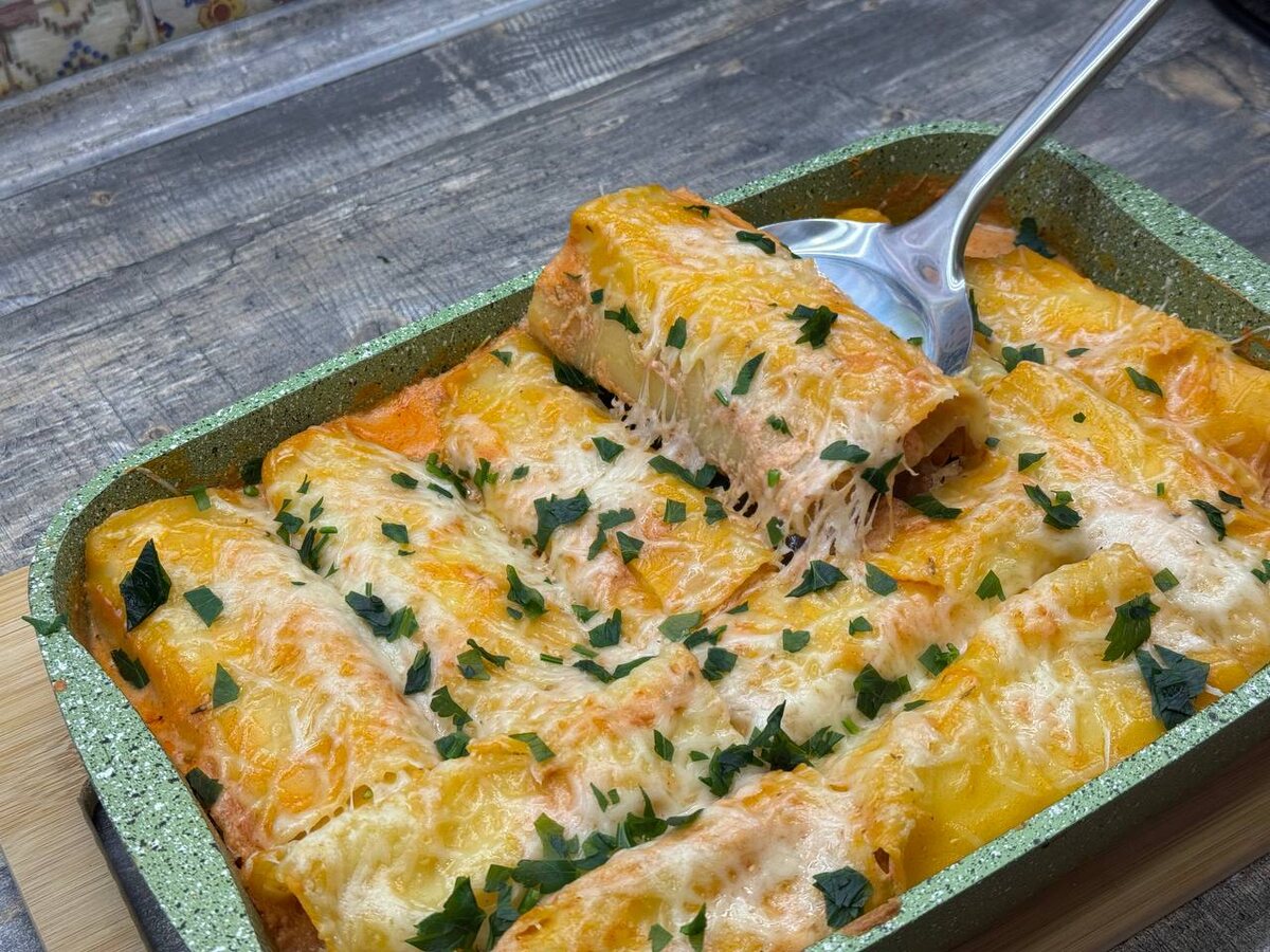 Этот рецепт предлагает великолепную альтернативу классической лазанье. Вместо традиционных слоев пасты, фарш заворачивается в листы, создавая аккуратные рулетики, которые не только прекрасно выглядят на столе, но и отлично держат форму. Блюдо отличается нежной текстурой и насыщенным вкусом благодаря идеальному сливочно-сметано-томатному соусу, который пропитывает рулетики и создает аппетитную румяную корочку.
