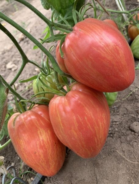 Плоды — весом 150–250 г, сердцеобразной формы и характерной сетки золотистых полосок на красном фоне. Мякоть мясистая, вкус насыщенный и ароматный. Универсальность проявляется в возможности потребления в свежем виде, переработке и консервации; выращивание возможно как в открытом грунте, так и в теплицах. В северных регионах тепличный метод помогает довести плодоношение до полного созревания.