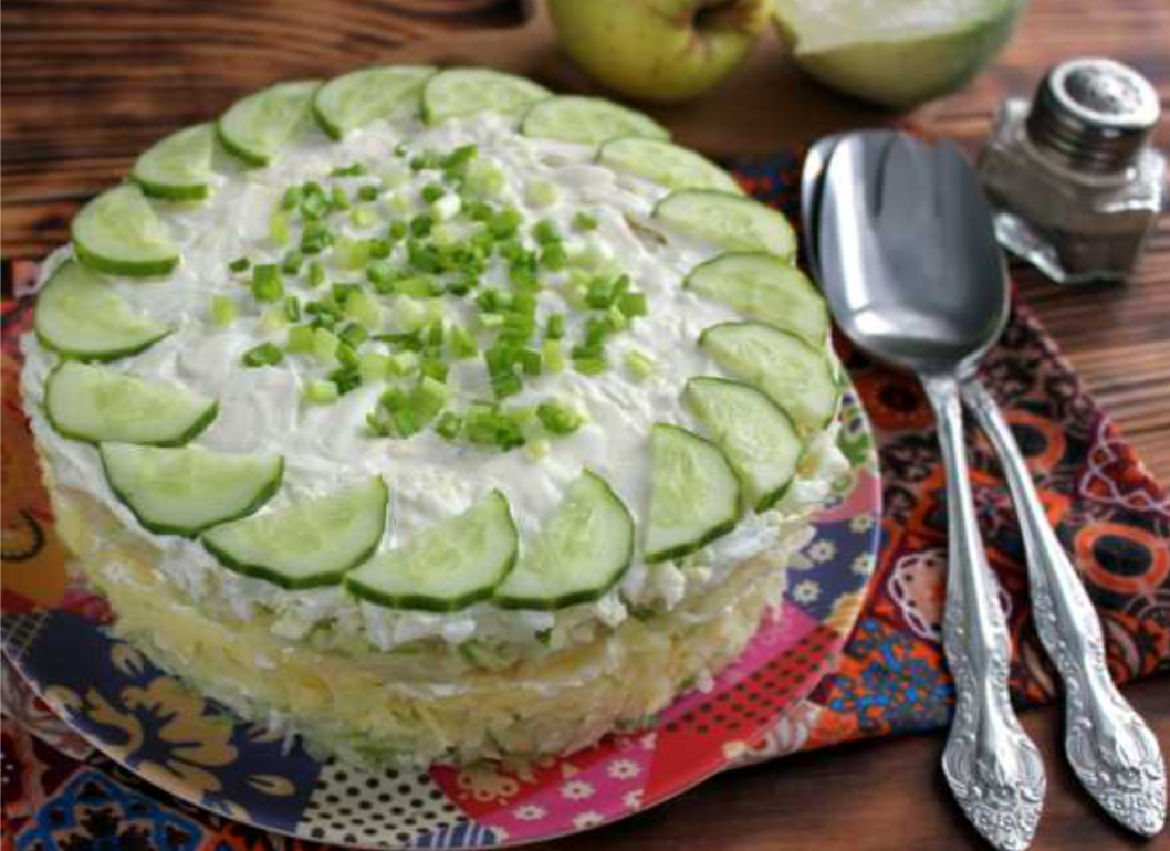 - 6-й слой: мелко нарезанный зелёный лук (можно украсить огурцом или укропом).