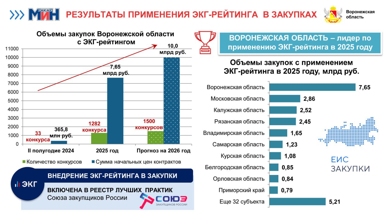 По поручению Полномочного представителя Президента в ЦФО Игоря Щёголева и губернатора Воронежской области Александра Гусева на протяжении двух лет в регионе ведется активная работа по внедрению механизма ЭКГ-рейтинга в закупочный процесс.
