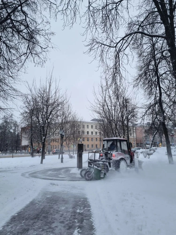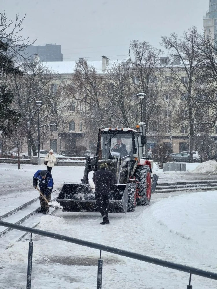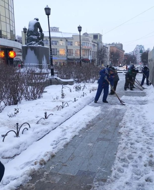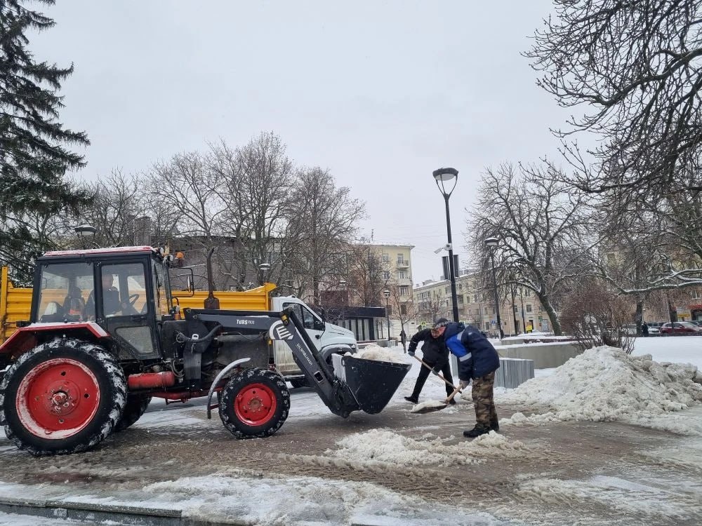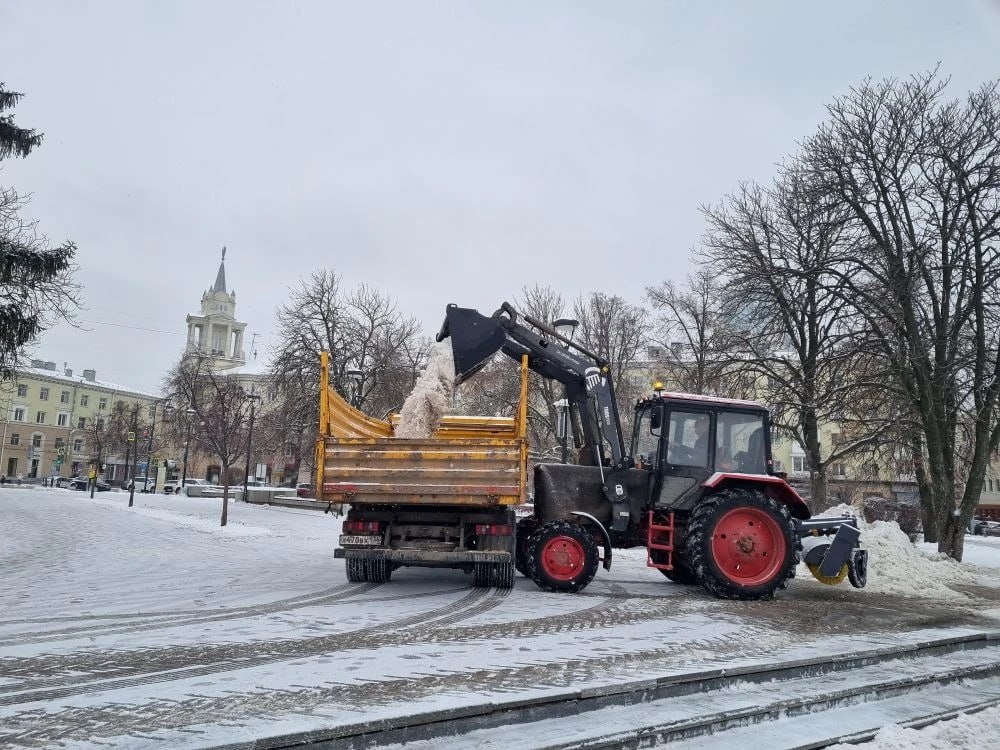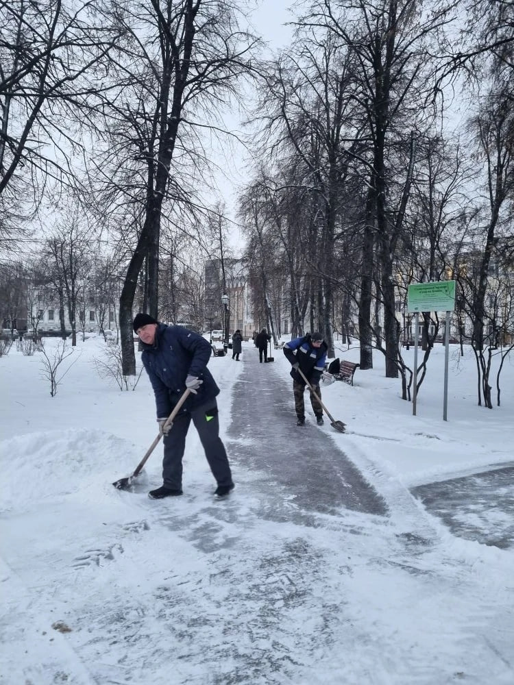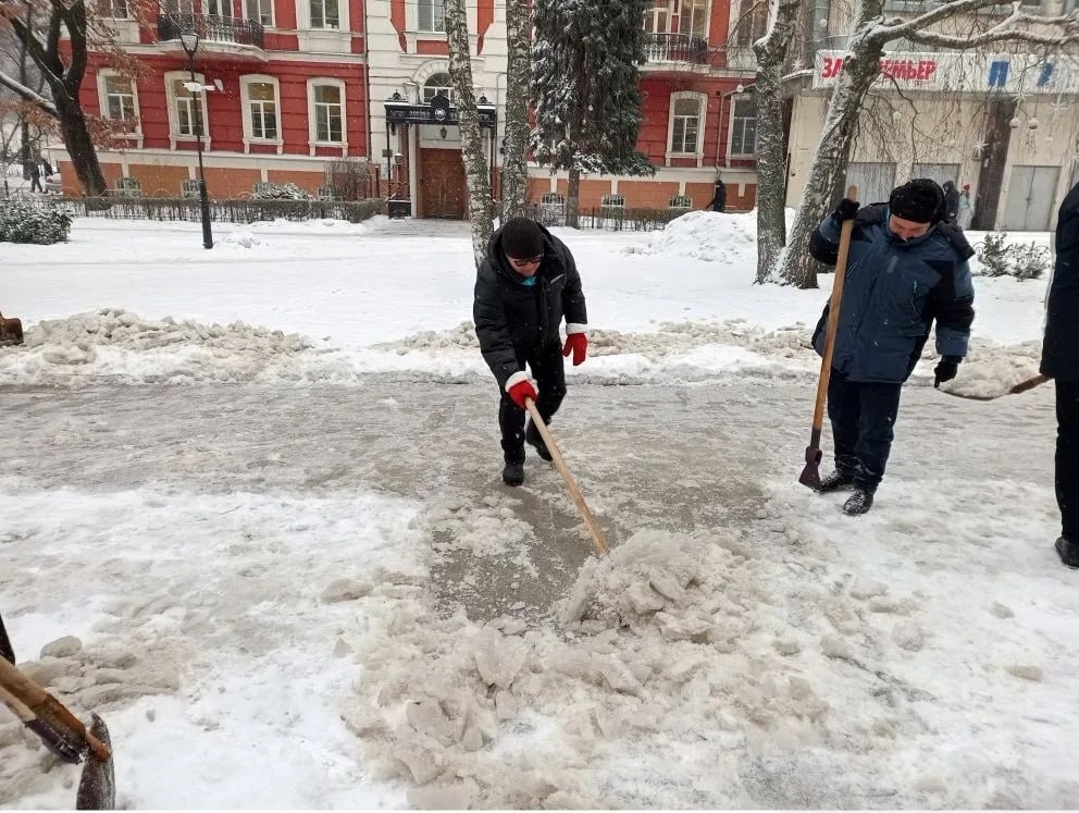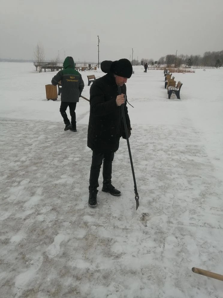 Сотрудники муниципального учреждения "Зеленхоз" ручным и механизированным способом убирают снег и наледь, образовавшуюся в результате выпавших осадков на территории сквера "Надежда", Петровской набережной, в сквере Советский, на бульваре по улице Карла Маркса и других озелененных территориях города, которые они обслуживают.