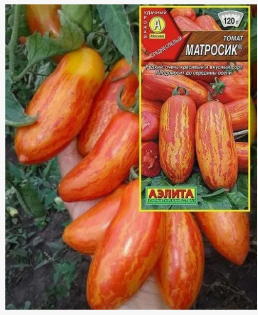 - Помидор Матросик: Индетерминантный сорт с оранжевым фоном и желтыми штрихами. Плоды достигают 120 г и имеют сладкий вкус. Срок созревания - 110-115 дней.