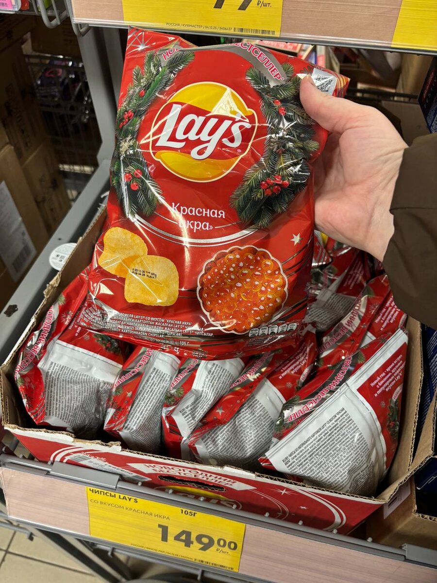 - Чипсы Lay's со вкусом красной икры – 149 рублей за 105 г.