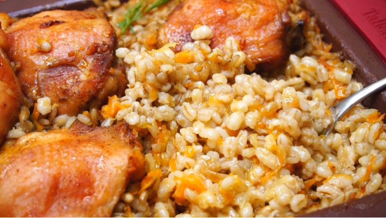 После этого в подготовленный противень выкладываются лук с морковью, замоченная перловка, и все хорошо перемешивается с приправами. Важно добавить достаточное количество воды, чтобы полностью покрыть крупу. Затем сверху размещается куриное мясо.