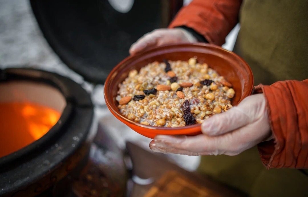 - Кроме поросёнка, на столе обязательно присутствовала щедрая кутья, богатая орехами, медом и изюмом. Это было универсальное угощение, которое готовилось из риса или пшеницы на молоке.