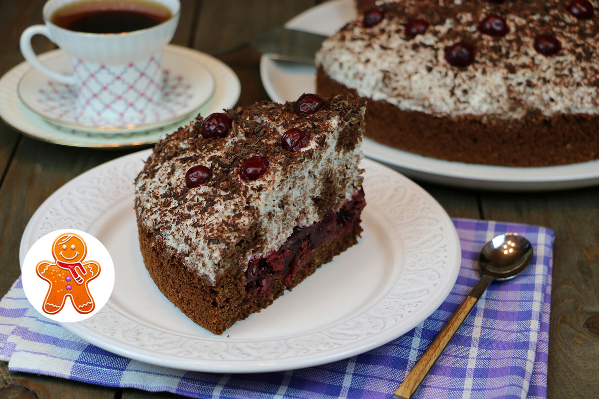 Вишня, размороженная заранее, готовится с сахаром и крахмалом. Полученный вишневый кисель выложите на нижний слой бисквита, пропитанного сахарным сиропом. После этого приготовьте крем, взбив сливки с сахарной пудрой и добавив часть из коржа.
