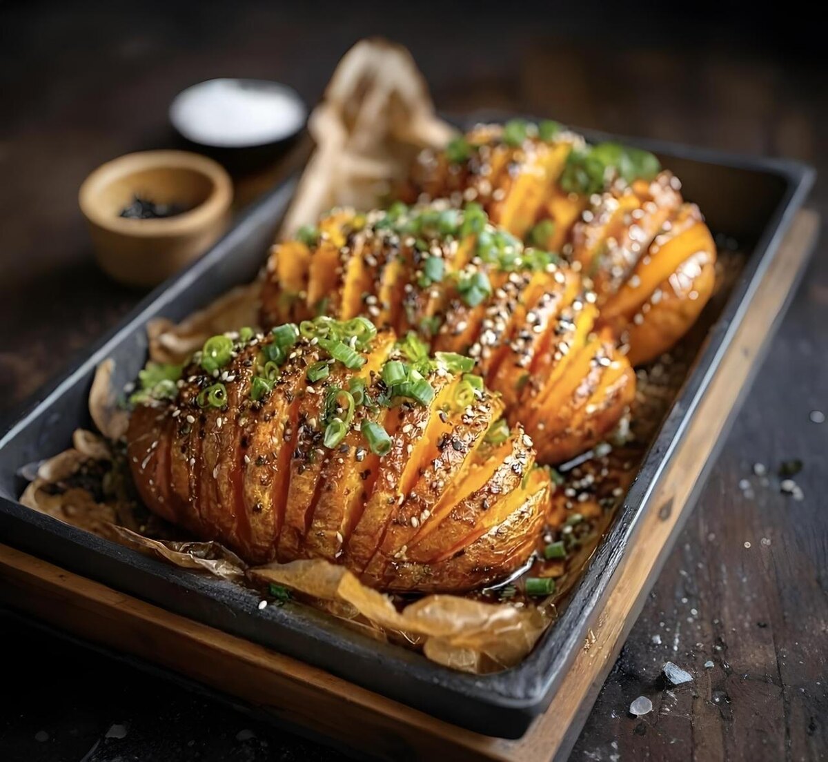 Перед подачей посыпьте бататы обжаренными семенами кунжута и свежей зеленью. Хлопья чили добавят немного остроты вашему блюду. Подавайте горячими и удивите всех непревзойденным вкусом!