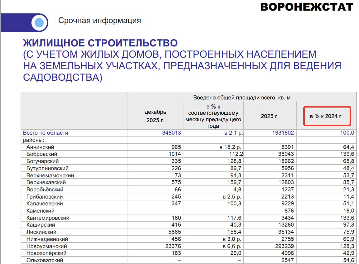 Только в 7 из 34 муниципальных образований Воронежской области по итогам 2025 года был зафиксирован рост объемов жилищного строительства. Причем в ряде районов стройка вообще «замёрзла»: в некоторых муниципалитетах объемы ввода жилья составили от 8,4 процента до 11 – 16 процентов от уровня предыдущего, 2024 года.