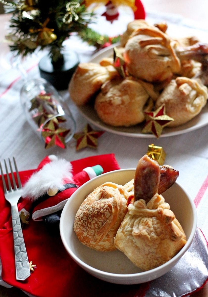 Разморозьте тесто при комнатной температуре. Далее нарежьте его на 10 частей: 9 для мешочков и 1 для бантиков. Квадраты должны быть примерно 9х9 см.