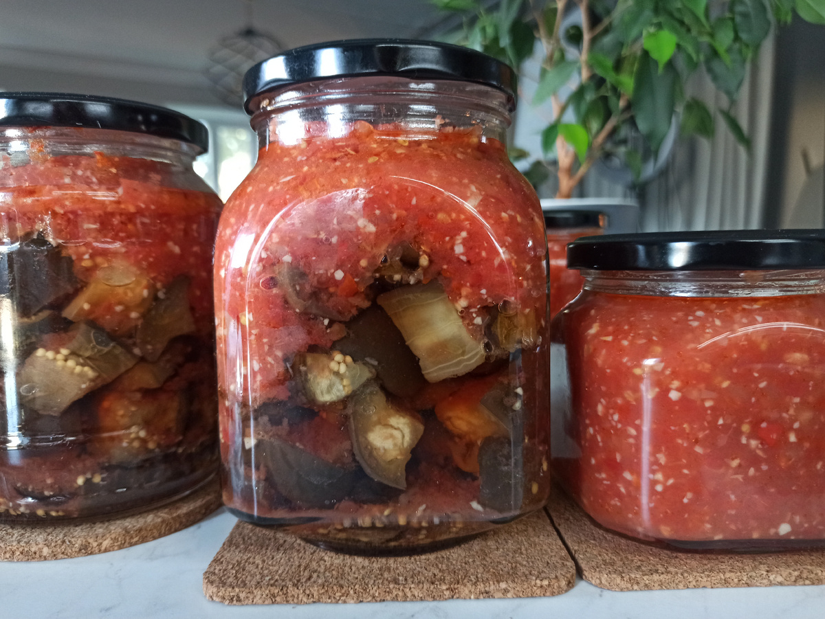 6. Разложить баклажаны в стерилизованные банки, залить горячей аджикой и закатать. Хранить такие заготовки можно при комнатной температуре.
