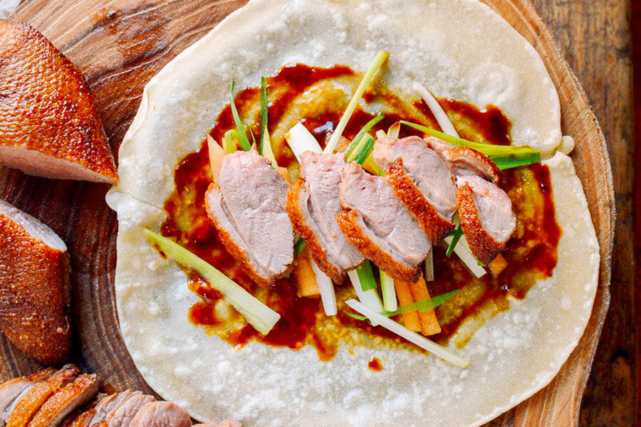 - На мандаринский блинчик нанесите соус Тяньмяньцзян, добавьте огурец, зеленый лук, дыню и утиную грудку. Заверните и наслаждайтесь!