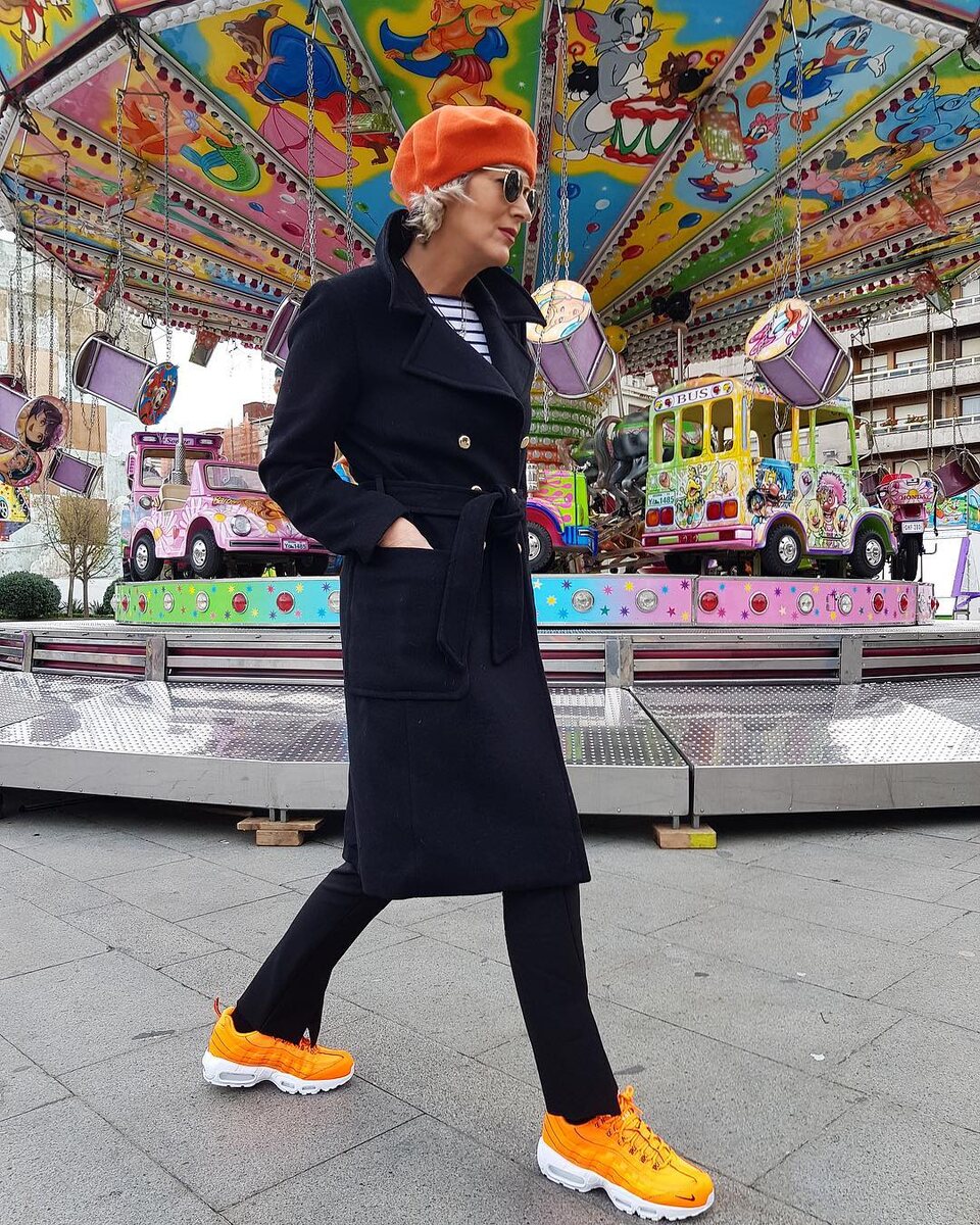 - Яркие акценты: черные прямые брюки и светлая полосатая кофточка выглядят стильно, особенно если дополнить образ оранжевым беретом и желтыми кроссовками. Такой наряд не будет скучным, а наоборот, привлечет внимание.