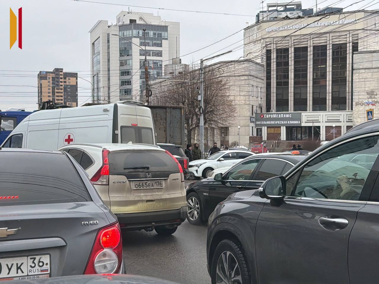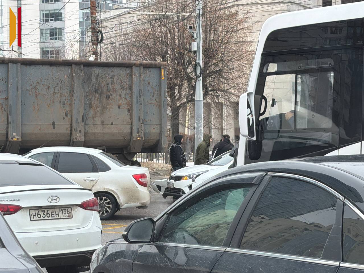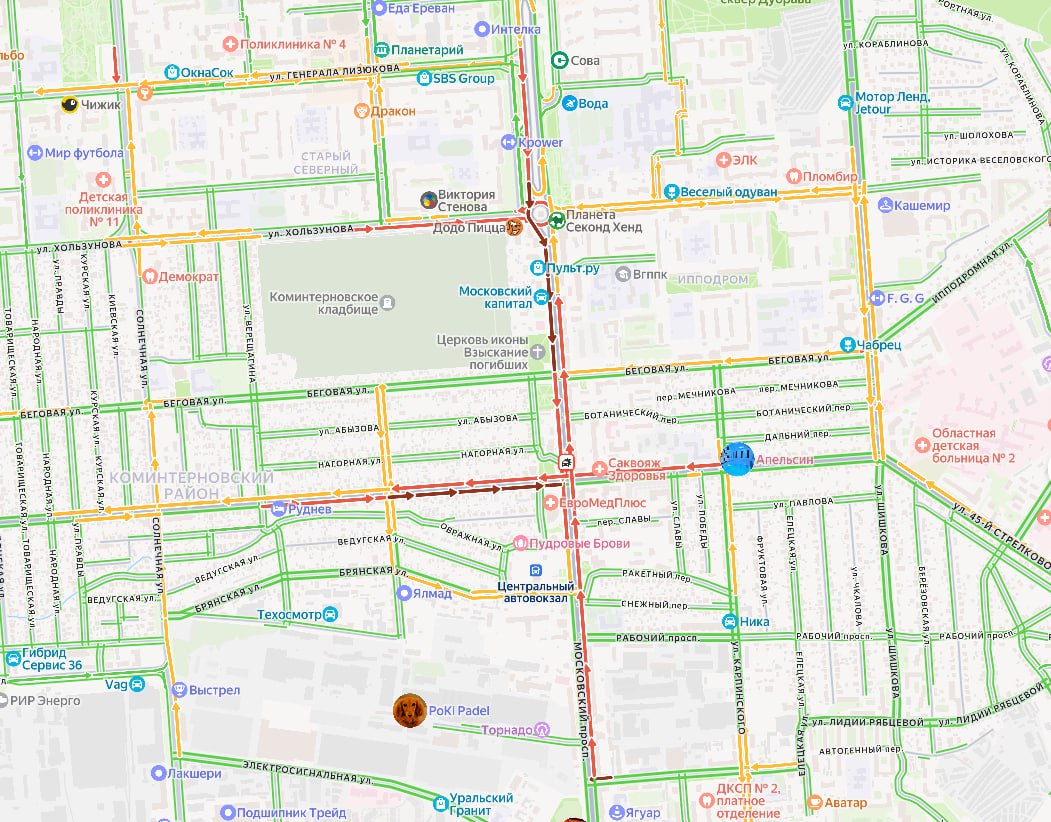 На пересечении 45-й Стрелковой Дивизии и Московского проспекта произошло ДТП с участием нескольких автомобилей. У одной из машин отлетел бампер. Мусоровоз заблокировал две полосы, из-за чего движение в обоих направлениях остановилось. Пробка растянулась на два километра.