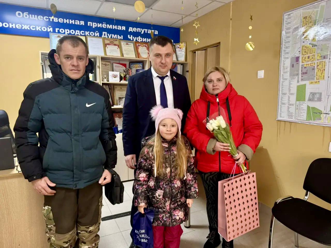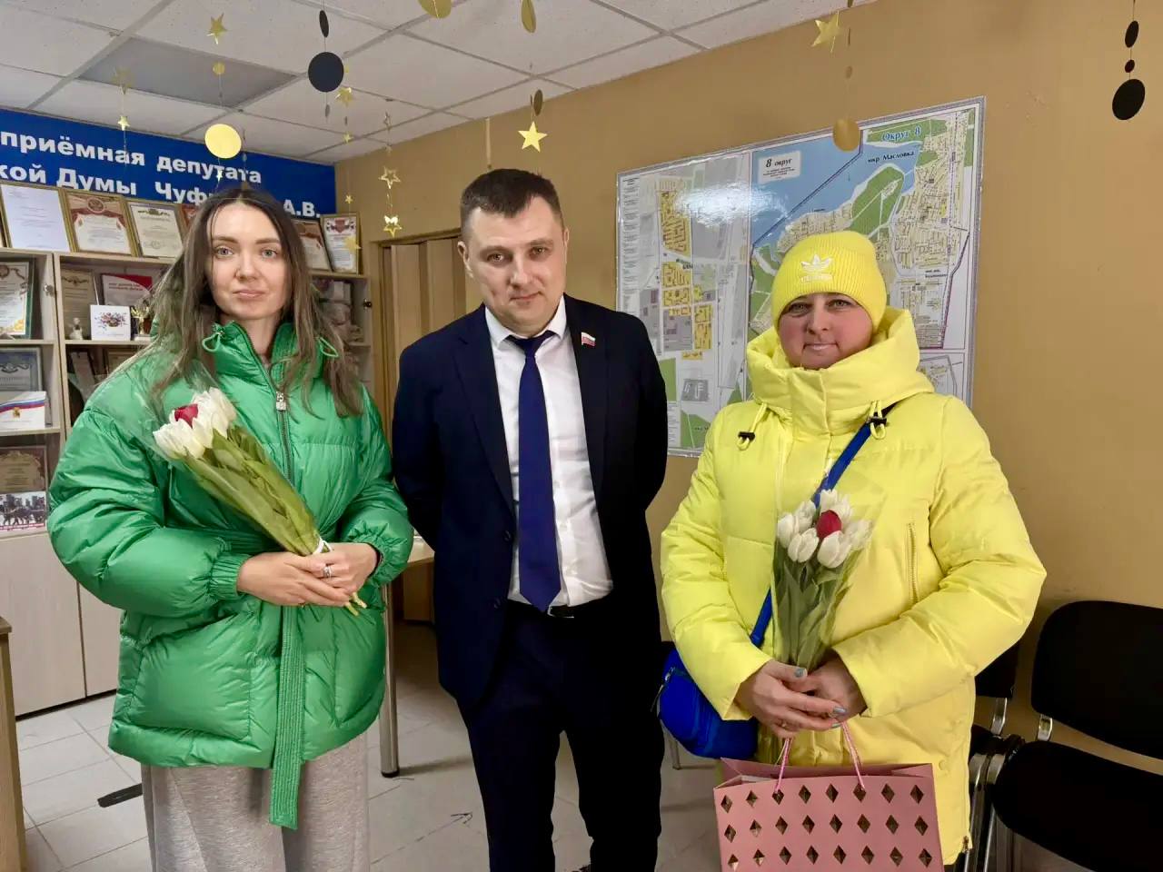 В преддверии праздника депутат Воронежской городской Думы Леонид Беляев поздравил сотрудниц учреждений социальной сферы и представительниц общественности, принимающих активное участие в жизни Железнодорожного района, и вручил памятные подарки.