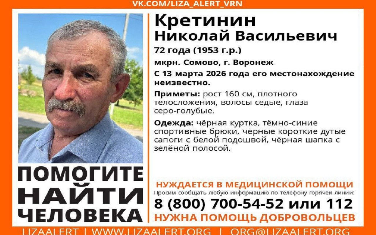 Внимательно изучите ориентировку! Николай Кретинин может находиться в любом районе города или передвигаться на общественном транспорте. Всех, кто владеет информацией о его местонахождении или видел похожего по описанию человека, просят сообщить по телефонам: 8-800-700-54-52 (добровольцы) или 112 (служба спасения).