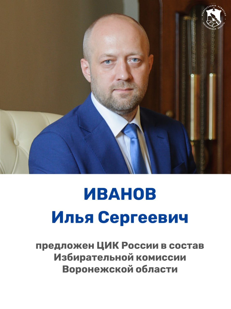 Илья Иванов с 2012 года участвует в организации и проведении избирательных кампаний на территории Воронежской области, с 2021 года возглавляет ИКВО. За период его работы в регионе успешно реализованы новые технические решения и передовые электоральные проекты, актуализирована законодательная база. Ранее работал в органах исполнительной власти области. Награжден Благодарностью Президента Российской Федерации, почетным знаком регионального Правительства «Благодарность от земли Воронежской».