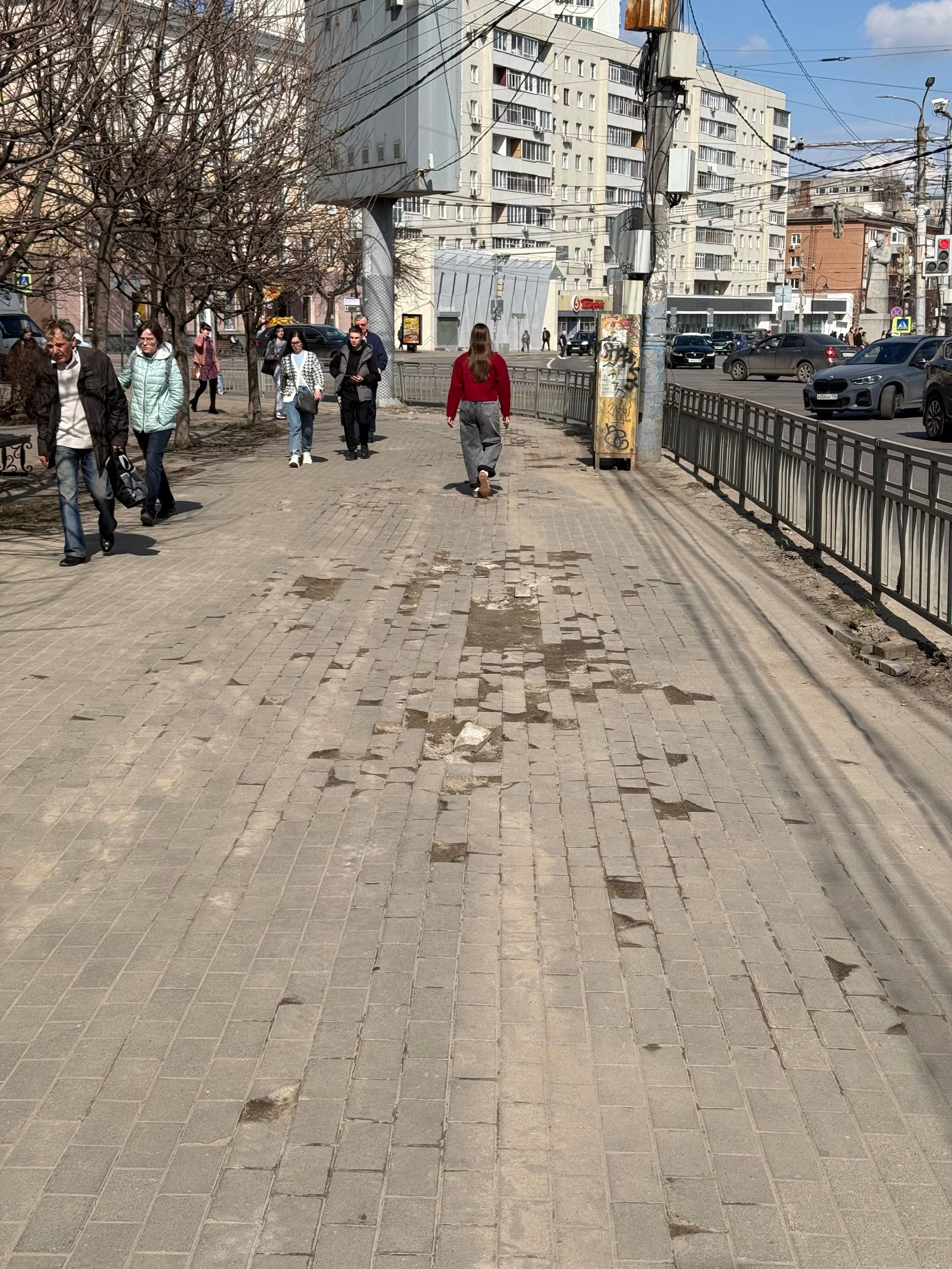 Весной оголяются не только люди, но и дороги. И тротуарная плитка на Кольцовской.