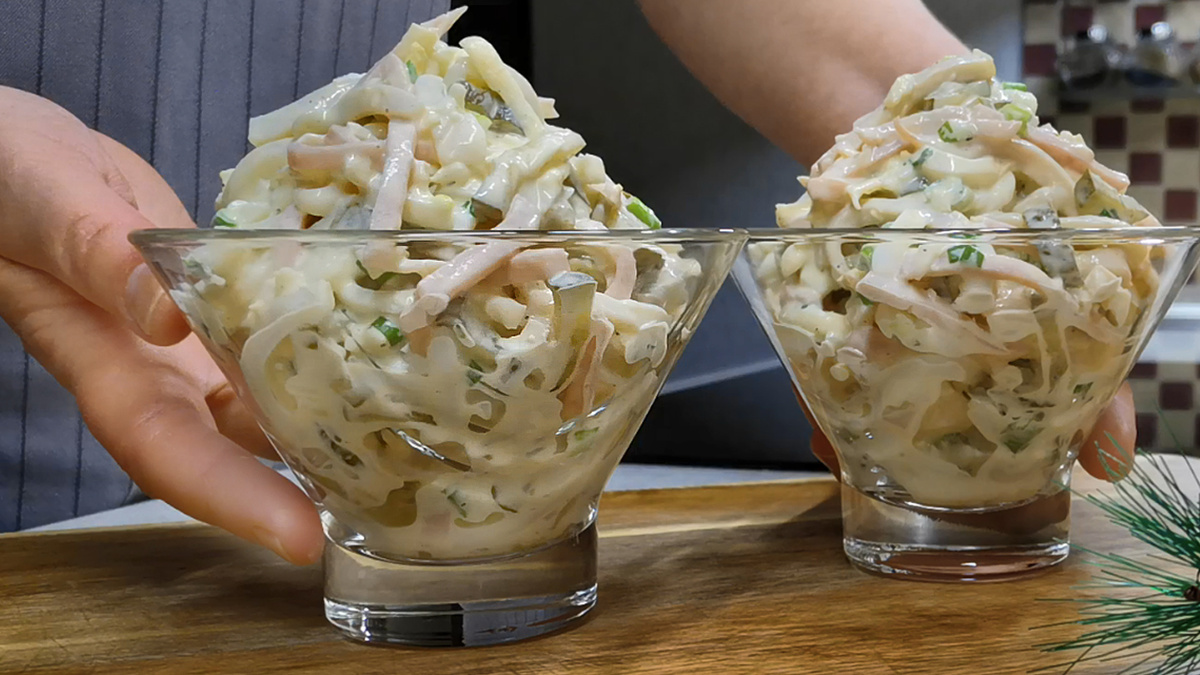 В этом салате кальмары снова на первом плане, и, казалось бы, сочетать их с ветчиной не совсем логично, но результат удивляет!
