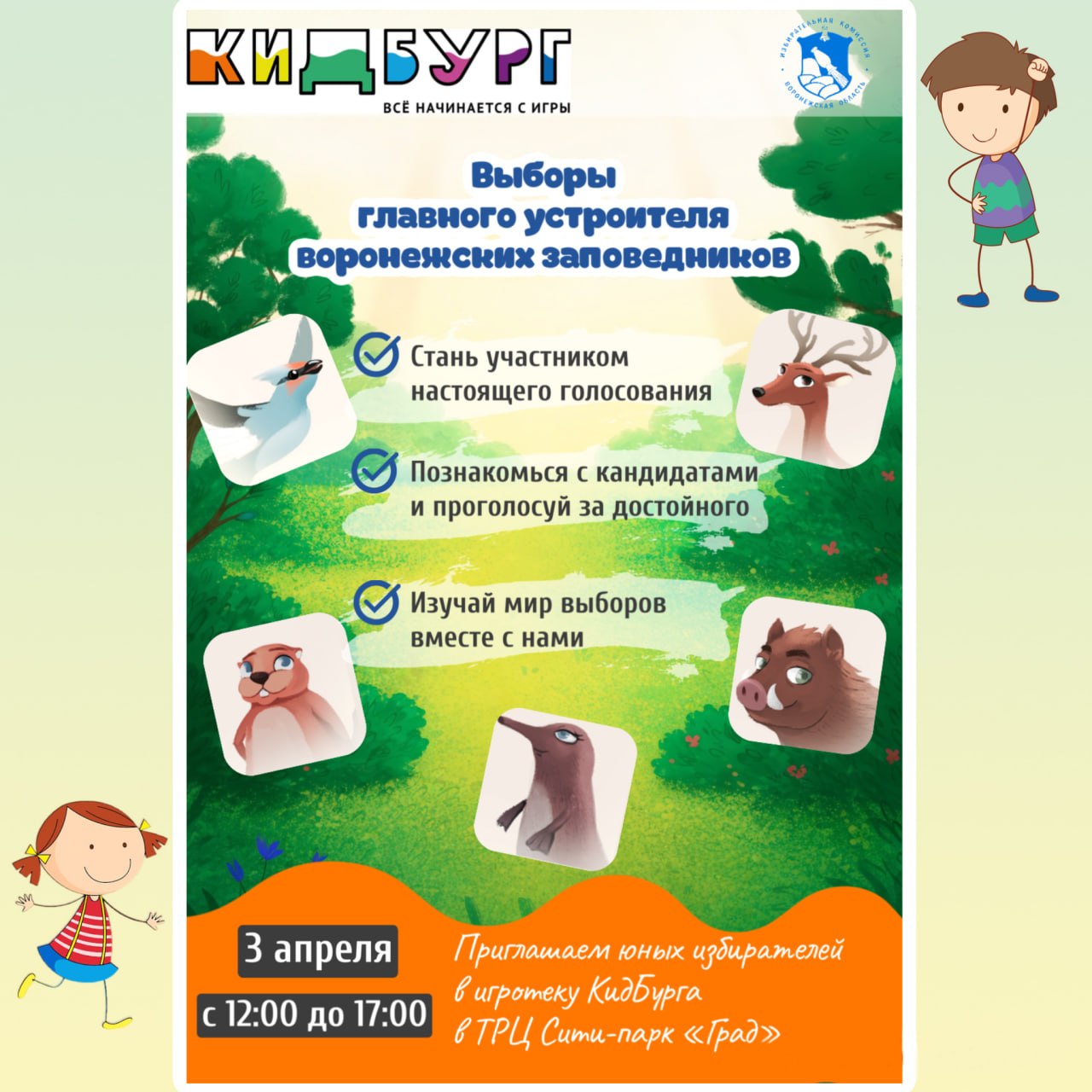 В эту пятницу с 12:00 до 17:00 в городе профессий КидБурге в ТРЦ Сити-парк «Град» пройдут выборы главного устроителя воронежских заповедников.