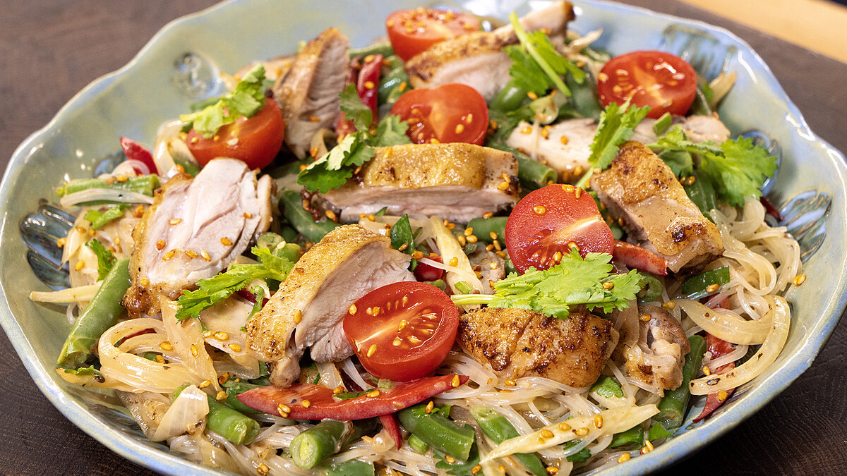 Сначала необходимо залить фунчозу кипятком на 10 минут, после чего промыть под холодной водой, чтобы приостановить процесс варки. Затем отделите мясо от куриных голяшек и выложите его на разогретую сковороду, кожицей вниз.