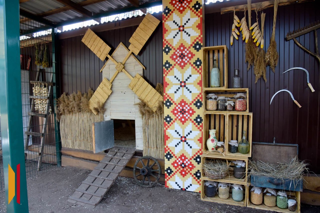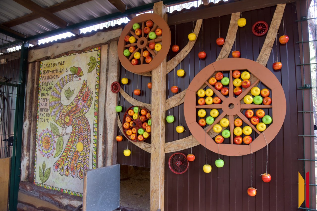Сегодня в зоопитомнике живут куры породы кохинхин, цесарки и даже павлины. Для них ко Дню птиц, который отмечается 1 апреля, подготовили необычные вольеры. Задумка создать декор для вольеров принадлежала штатной художнице Воронежского зоопарка имени А. С. Попова Ирине Пожарской. В своей работе она решила объединить деревенские мотивы с элементами из русских сказок. Украшение каждого вольера адаптировалось под птицу, которая в нем живет. Так, клетка гуся дополнилась печкой и летящими птицами из сказки «Гуси-лебеди». А в вольере с курами появились мельница и золотистые поля – именно такие ассоциации у Ирины Пожарской вызвали зерна, которыми кормят этих представителей пернатых. В панно Ирины Пожарской органично вплелись настоящие старинные предметы русского быта. Многие из этих атрибутов зоопитомнику передал уроженец Новохоперска Александр Копытин.