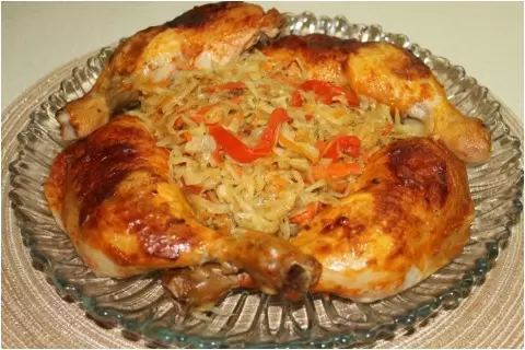 4) Овощную смесь распределить по форме для запекания, сверху уложить куриные окорочка.