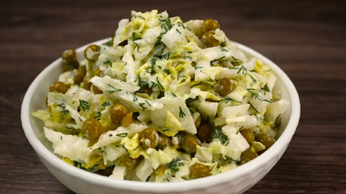 Основа — хрустящая пекинская капуста и зелёный горошек, сочетающиеся с ароматом укропа. Заправка держит баланс между лёгкостью и насыщенностью: сметана, чеснок и щепотка горчицы создают искру вкуса без тяжести майонеза.