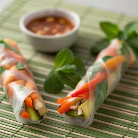 - Спринг-роллы с овощами и кешью: легкие и свежие, они идеально подходят для перекуса. Заполните рисовую бумагу морковью, огурцом и кешью, и подайте с соусом чили.