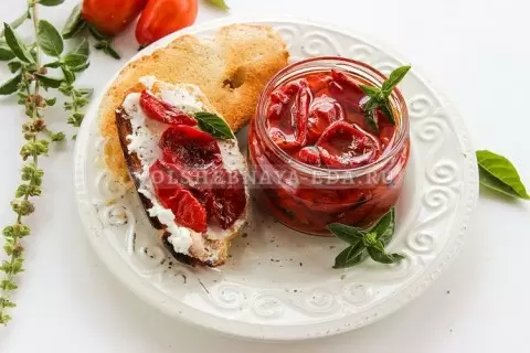 Вяление следует производить в духовке при температуре 70-80 градусов в течение 4-5 часов. Для лучшего результата, можно на этапе сушки вводить воздух, приоткрывая дверцу духовки. Готовые томаты должны оставить мягкими и упругими, сильно уменьшиться в размере, изменив цвет на более темный за счет процесса приготовления.