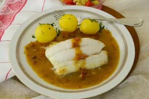 На завершающем этапе в сковороду помещается филе трески. Нужно накрыть крышкой и томить около пяти минут, пока рыба не станет нежной и полностью готовой. Блюдо готово к подаче!