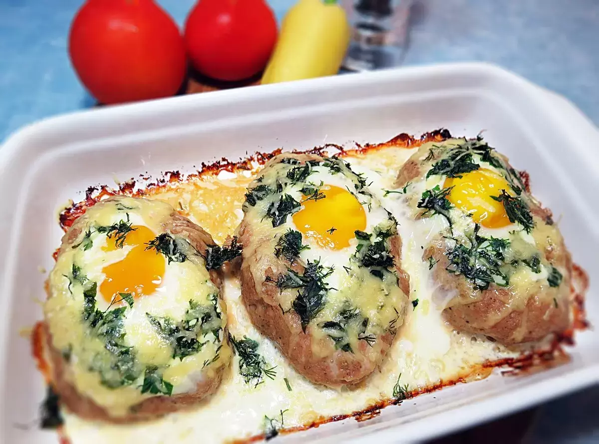Чтобы сотворить завершающий штрих, в каждую котлету аккуратно разбейте по яйцу, сохранив целостность желтка, и отправьте назад в духовку еще на несколько минут. При желании добавьте свежую зелень перед подачей, чтобы придать блюду эстетичный вид.