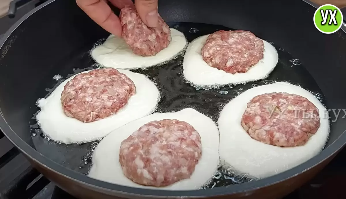Сформировав маленькие котлетки из фарша, можно начинать жарить. В сковороду наливается немного растительного масла, которое разогревается на среднем огне. Затем выкладываются столовые ложки теста, сверху помещаются котлетки, которые нужно чуть прижать. Сковороду накрывают крышкой и жарят до румяной корочки, после чего аккуратно переворачивают и доводят до готовности еще несколько минут.