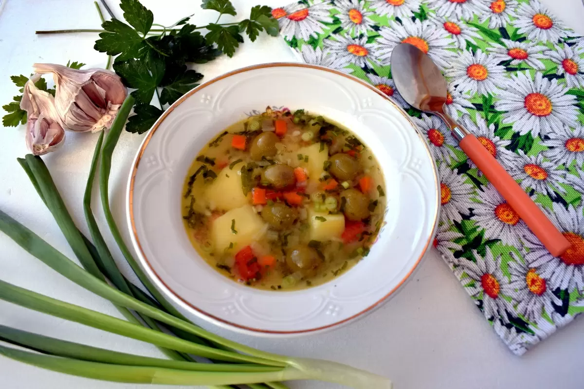 После того как картофель почти готов, добавляются обжаренные овощи и оливки с рассолом. Суп варят до полной готовности картофеля.