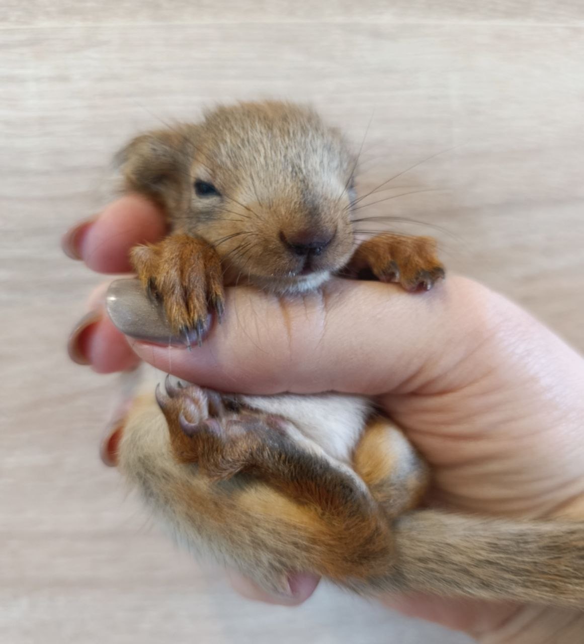 К волонтерам из «Сердце леса» поступила белочка, ее возраст — около 40 дней. Она выпала из гнезда в парке «Алые паруса». Люди спасли ее от вороны.