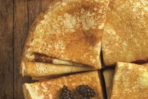 5. Готовые блины складываем: наносим на одну половину тонкий слой сладкого творога, затем складываем пополам и еще раз, формируя треугольник.