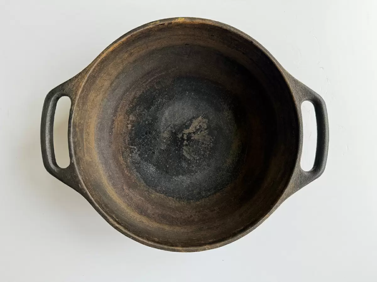 - Серый оттенок. Появление серого цвета может свидетельствовать о том, что натуральная жировая патина была смыта, и обработка посуды требует повторного прокаливания.