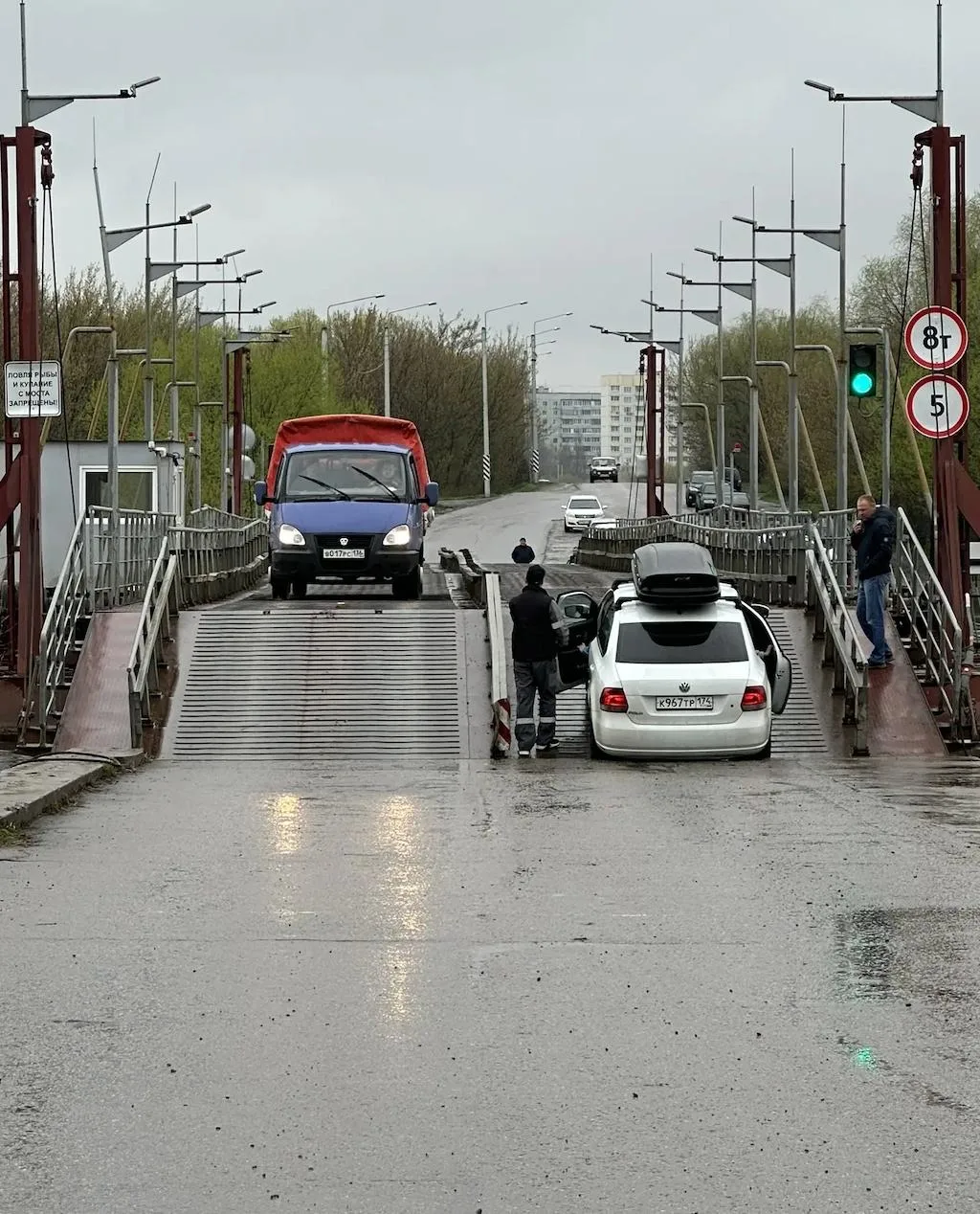 Уровень воды за прошедшие сутки снизился на 2 см. Заезд на мост затруднен из-за дождя. Аппарели мокрые, и без разгона заехать на переправу не получается.