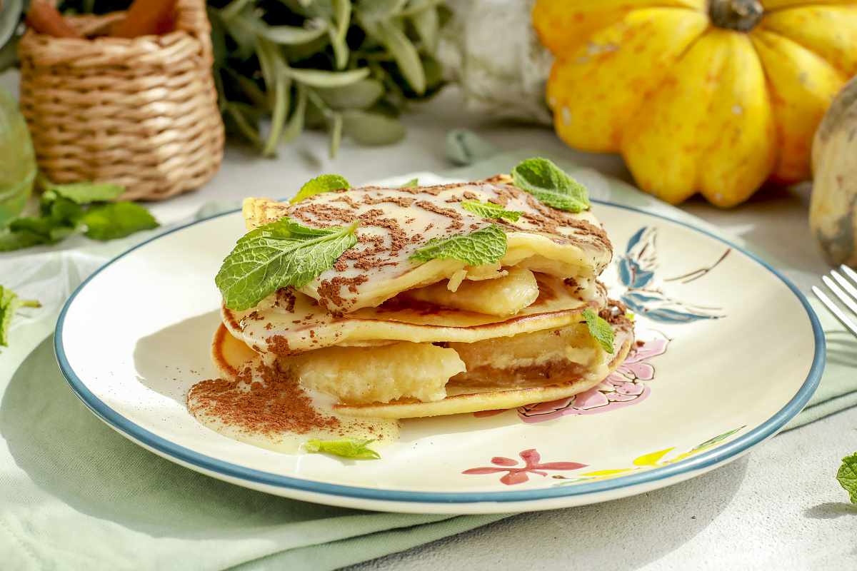 Начинаем с теста: яйца, молоко, мука и щепотка соли соединяются в гладкую структуру. Бананы нарезаются и подрумяниваются на сливочном масле, создавая ароматный слой внутри оладий. Шоколад плавится на водяной бане, сливки добавляют нежность, и спустя несколько минут глазурь готова к поливанию. Финальный штрих — какао-пудра и свежая мята, которые подчеркивают контраст сладости и свежести. Всё вместе превращает обычные оладьи в уютный десерт на двоих.