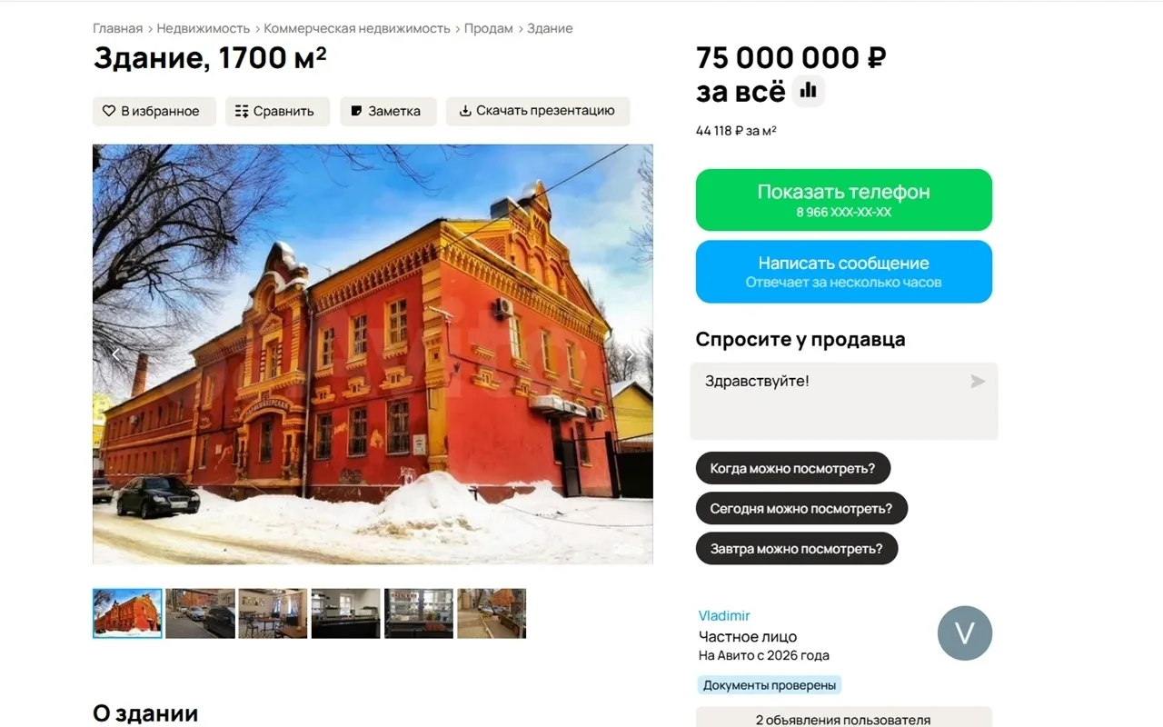 В феврале стоимость была выше на 20 млн рублей. По словам владельца, нынешняя цена на здание действительна в течение месяца.