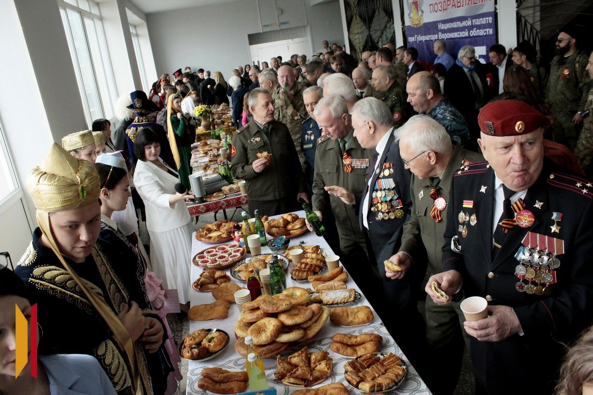 Для гостей приготовили богатые столы с национальными блюдами народов бывшего Советского Союза. Ребята, угощавшие гостей, также были одеты в национальные костюмы. Перед гостями выступили артисты Народного коллектива Воронежской области – ансамбля народной и казачьей песни «ЛюбоЖить» под руководством Наталии Дудиной.