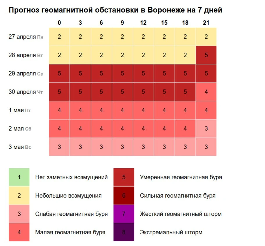 В целом с 29 апреля по 2 мая прогнозируют геомагнитные возмущения от слабой до умеренной бури.