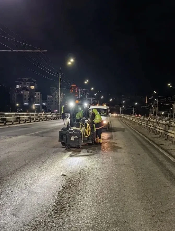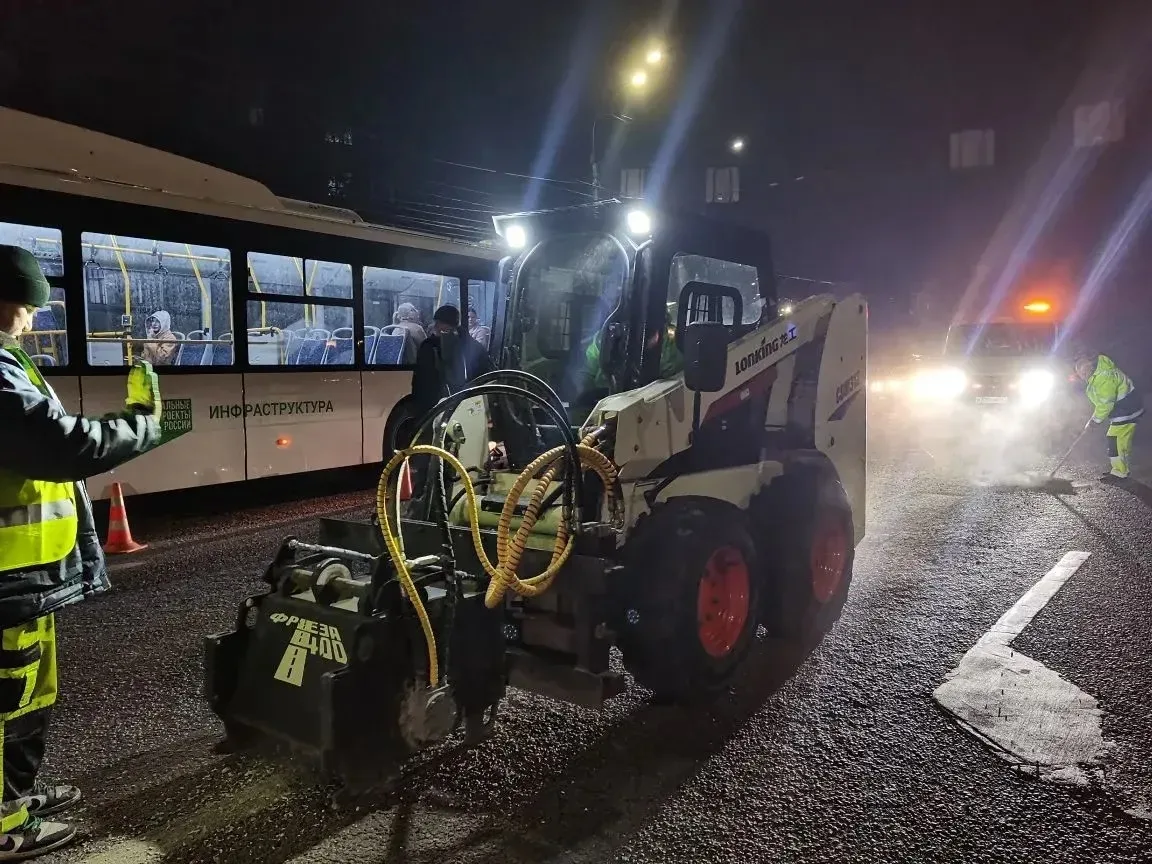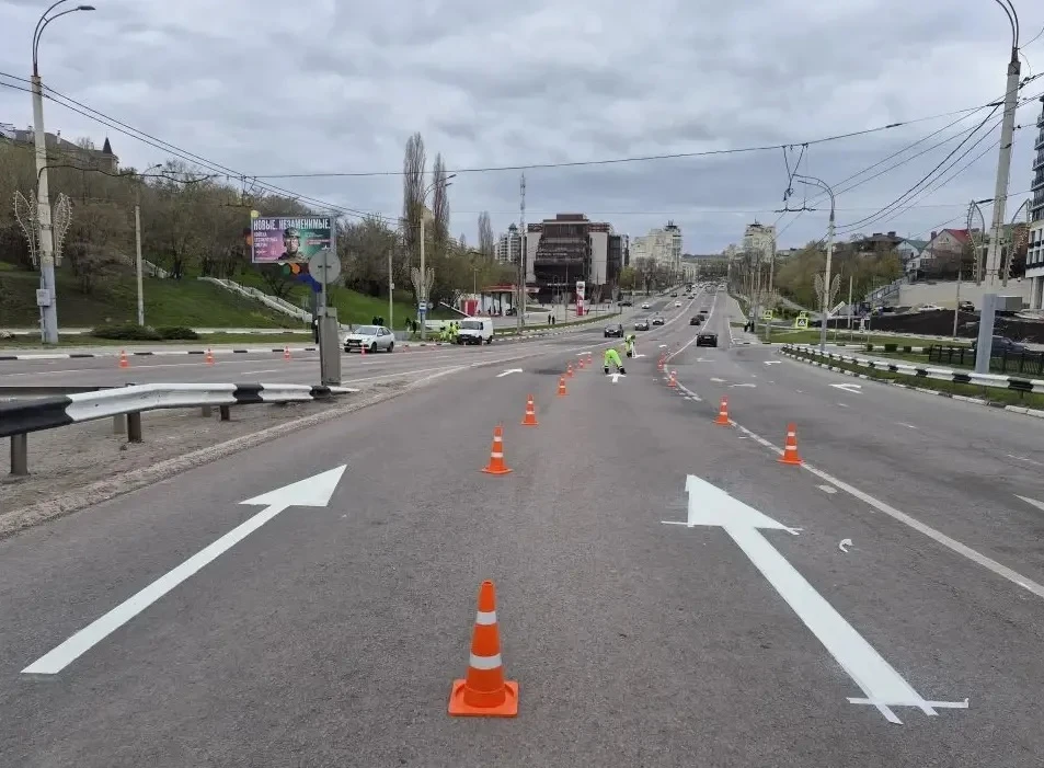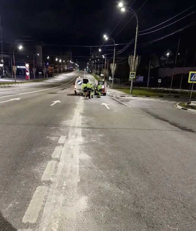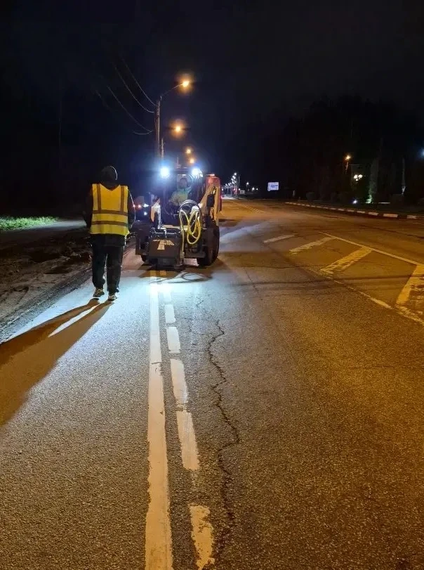 Подрядная организация продолжает демаркировку старых линий. Параллельно начинается нанесение новой разметки.