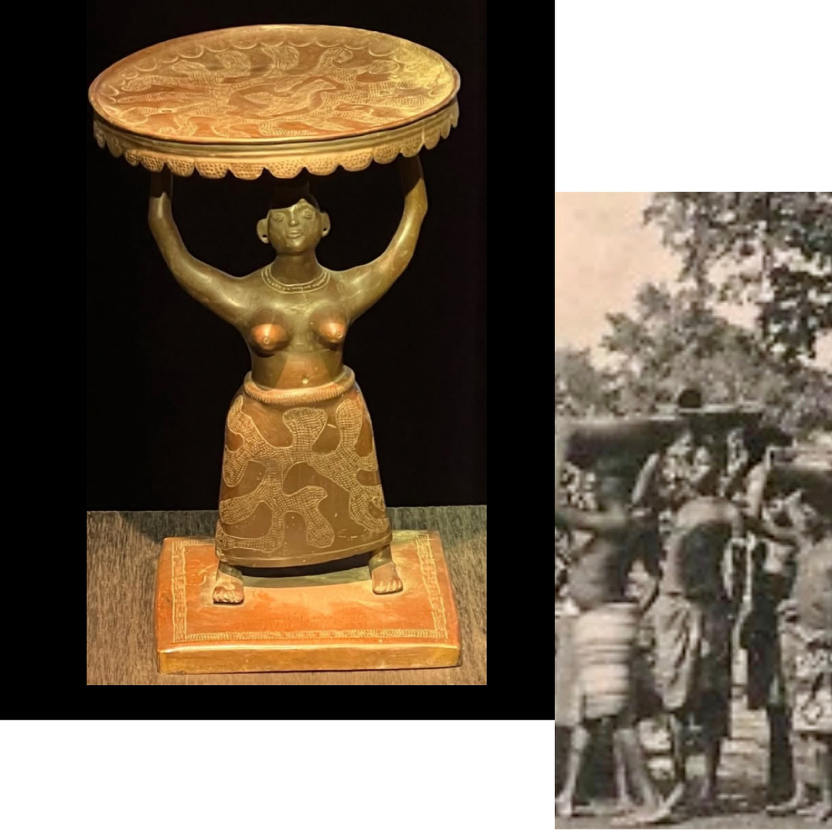 На фоне исторического контекста королевства Дагомея в Бенине, завершающий XIX век презентует захватывающий бронзовый объект — фигуру женщины с подносом. Это произведение искусства затрагивает сущность значимости женщин в экономике и традициях общества того времени.