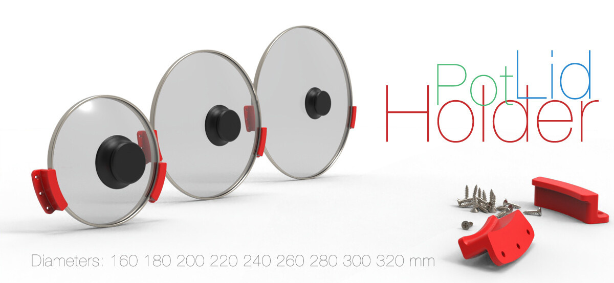 Держатель изготовлен из PETG или другого подходящего пластика, позволяя каждому пользователю выбрать материал по своему вкусу. Это решение позволяет не только сохранить порядок на кухне, но и сделать крышки более доступными в процессе готовки.