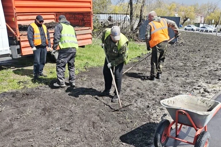 На первом этапе рабочие подготовилит грунт: после уборки пескосмета, который попадал на газонные части во время очистки тротуаров, землю разрыхлили и добавили плодородный слой.