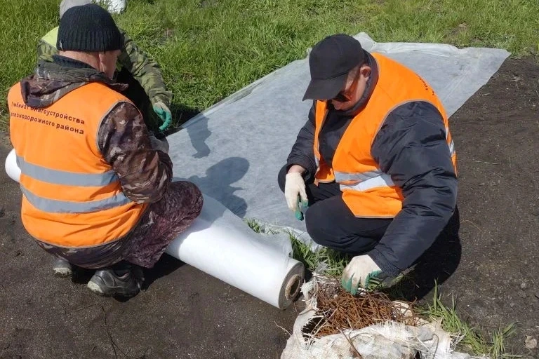 Далее сотрудники коммунальной службы вручную выполнили посев семян, после чего засеянные площади застелили дышащим укрывным материалом. В период всхода травы он защищает газонные части от ветра и птиц и не препятствует естественному увлажнению почвы.